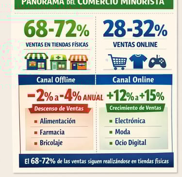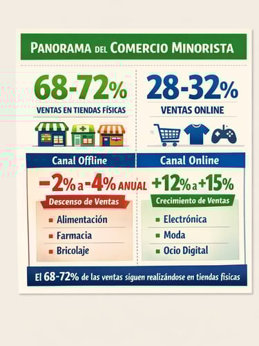 España. El comercio minorista atraviesa un momento de fuerte transformación. Aunque el canal online sigue creciendo, el 68–72 % de las ventas totales continúa realizándose en tiendas físicas, lo que confirma que el offline sigue siendo mayoritario. Sin embargo, esta fortaleza convive con una tendencia preocupante: la caída sostenida de ventas y tráfico en el comercio físico tradicional.